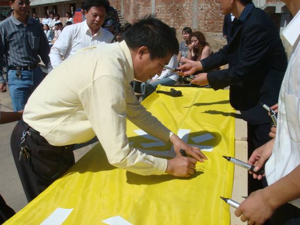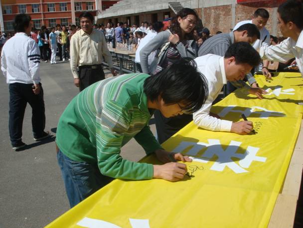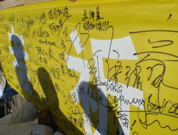 本次活动特邀张家口电视台、张家口晚报进行宣传报道。学院领导和高新区民政局有关领导亲临活动现场,陈院长代表学院讲话并带领全体人员向5.12大地震受难同胞表示哀悼,同时对广大学生提出了殷切的希望和明确的要求。活动中还邀请到震后由我市大北车行安排就业的三十名来自四川德阳灾区的受灾同胞,他们与我系学生共同表演了《感恩的心》,并接受了beat365官网和高新区民政局共同捐赠的慰问品,灾区同胞因此倍感温暖。随之,在《让世界充满爱》的音乐声中开始了“为生者祈福、为逝者哀悼”万人签名活动,由全校师生在长卷上献出自己的爱心,送上自己对灾区人民的祝福。