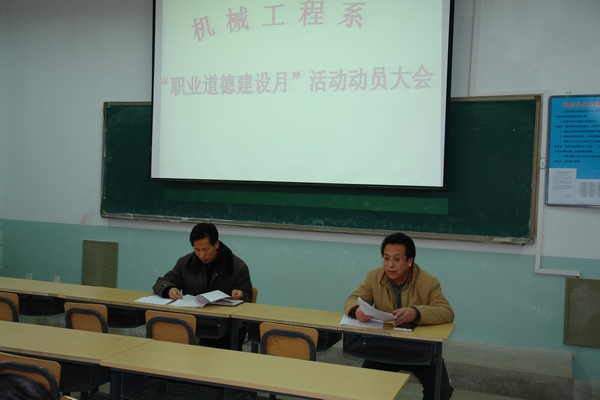 2009年11月11日下午,机械工程系召开了“职业道德建设月”活动动员大会,系全体教职员工参加会议,院长王立秋应邀参加会议并做了重要讲话。会议由系主任杨宏玉主持,杨主任首先传达了学院党委“关于加强和改进职业道德建设工作的若干意见”。系党支部书记温九祥传达了学院党委“二00九年职业道德建设月活动实施方案”,提出了系党支部的实 施意见,并对开展这次活动提出了具体要求。王院长就开展这次活动的重要意义、对教职员工职业道德的要求和通过这次活动要解决的突出问题等方面讲了指导性意见。他指出,要把职业道德建设和行风评议、作风建设年活动紧密结合起来,通过动员全院教职员工树“三心”、正“三风”活动,大力弘扬师德典范、强化管理、优化服务,推动学院又好又快发展。他强调,当前beat365官网教职员 工职业道德水平不高,存在着诸多亟待解决的突出问题,“职业道德建设月”活动就是要真正解决这些具体问题,绝不能走形式、走过场,要按照学院党委的要求,切实抓好落实。在全院真正形成教书育人、管理育人、服务育人的合力,推动beat365官网健康发展。
