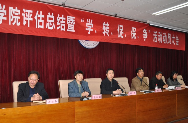 会上,院长王立秋作了评估工作总结报告,党委副书记、纪委书记史慧武宣读了学院党委“关于开展'学、转、促、保、争'活动的实施意见”,党委书记胡炜作了重要讲话,党委副书记张树敏主持大会,副院长陈怀勇、许建平出席大会。