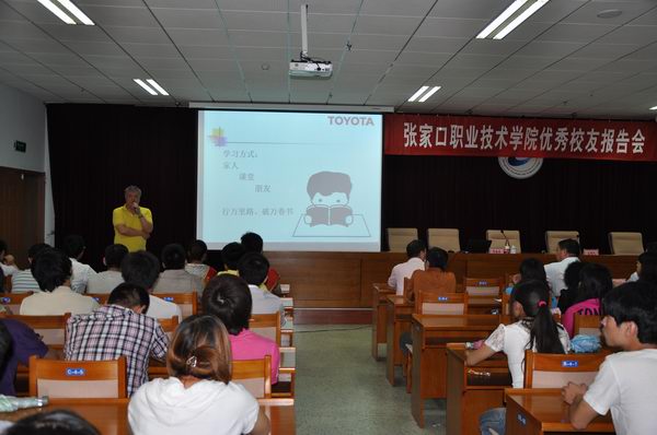 常翰林,原张家口工业交通学校82届毕业生,现任张家口华铃丰田汽车销售服务有限公司董事长。常翰林董事长从自身经历出发,结合专业知识与自身经历,围绕 “创业、创造、创新”、“责任、快乐、价值”、和“协调发展、准时化生产、顾客至上”的企业文化,三个方面进行了详细的解读。常翰林学长朴实真挚的话语、深入浅出的讲解赢得了同学们一阵阵热烈的掌声。