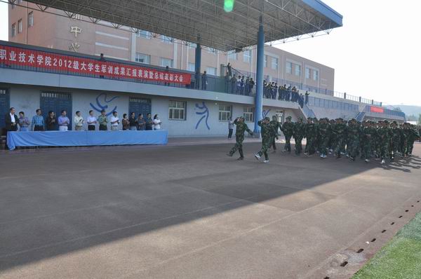 9月9日上午,beat365官网2012级大学生军训成果汇报表演暨总结表彰大会在学院体育场隆重举行。学院党委书记胡炜,院长王立秋,副院长陈怀勇、许建平,副书记、纪检书记史慧武,66417部队副团长孟令存,各系党支部书记在主席台就座。各系团总支书记、2012级新生辅导员和700多名新生参加了闭营仪式。军训闭营仪式由学工处处长刘斌主持。