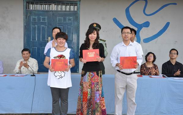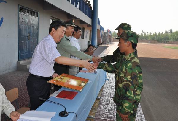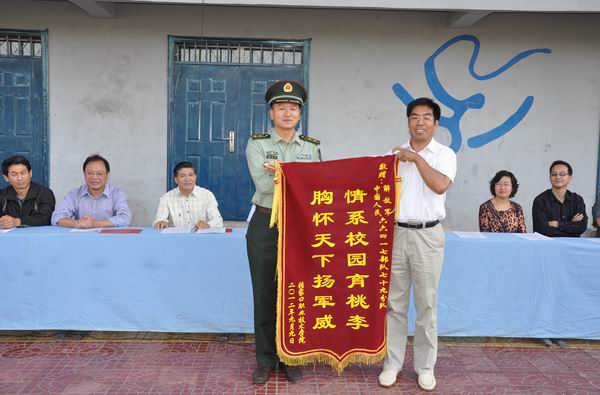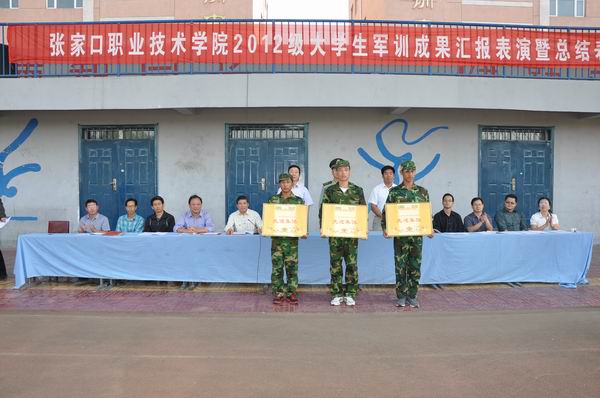 随后,学院领导为大学生军训标兵、优秀辅导员颁发放了奖状。院长王立秋向66417部队副团长孟令存中校赠送了锦旗。