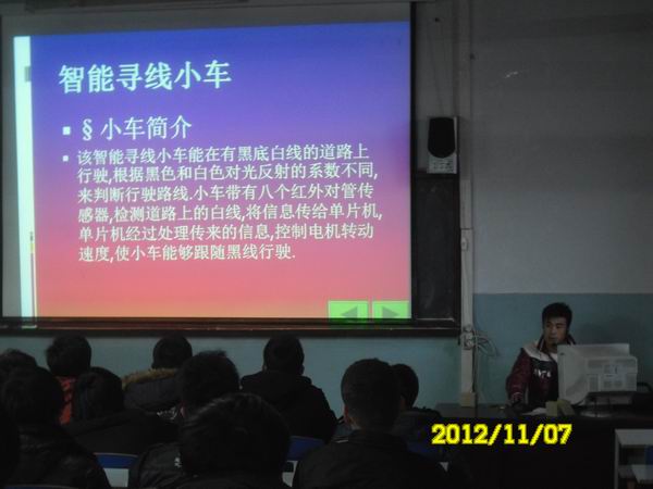 为迎接即将到来的2012年河北省电子信息职业技能大赛,11月7日,电气工程系在小阶梯教室召开了技能大赛赛前动员会。刚刚在“第三届全国高校电子信息实践创新作品评审交流研讨会”上获奖的罗振成老师和王硕同学出席了会议,给在场学生做了精彩的报告,并提出了宝贵意见。罗老师指出,大家一定要从基础抓起,树立科学的训练观,注重方法,敢于创新,满怀信心的去参加比赛。王硕同学就自己的参赛作品“智能寻线小车”展开话题,从前期准备、设计思路和参赛经历等方面做了详细分析。