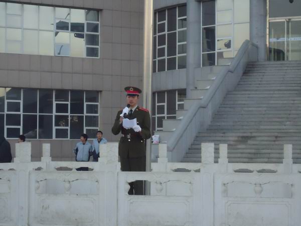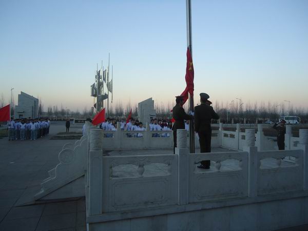11月26日,隆重庄严的升国旗仪式在行政楼前举行,学院各学生组织上百人参加了此次活动。7点整,全体同学就准备就绪,整齐地站在旗杆两侧。升旗仪式正式开始后,在国旗护卫队铿锵有力的步伐中,在精神抖擞的旗手护送下,在雄壮的《义勇军进行曲》中,鲜艳的五星红旗冉冉升起,全体学生行注目礼,爱国之情油然而生。