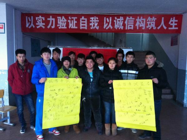 随着期末考试的临近,为了加强考风建设,进一步在大学生中植入诚信理念,不断提高学生群体的诚信意识,经济管理系于12月19日开展了以“以实力验证自我,以诚信构筑人生”为主题的诚信考试宣传倡议活动。