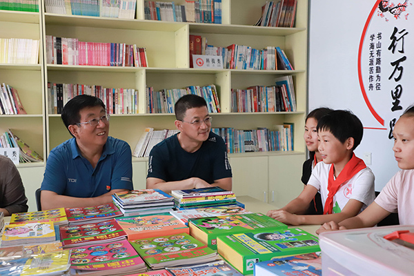 在肖家堡村村委会公共图书室内,冯印涛、徐蕾、孙眉、刘刚向矾山镇肖家堡村捐赠了教育、文化类精品图书百余册及部分文教用品,并与村小学的孩子们进行畅谈。冯印涛勉励孩子们要发奋读书、多读书、读好书,以优异成绩回报家乡,建设家乡,做对家乡、对社会、对国家有用的人。