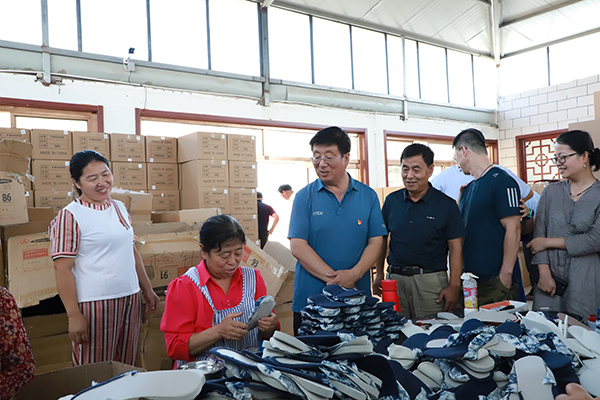 随后,冯印涛一行又来到了肖家堡村集体企业——涿鹿宏韵服装服饰有限公司进行参观。涿鹿宏韵服装服饰有限公司是由中龙集团公司资助30万元建立的村集体企业。宏韵公司投资10多万元购置了加工设备,利用村内原有闲置房屋建起厂房。公司与涿鹿金和服装服饰公司、日本山川株式会社合作,采取来料加工生产模式,生产的拖鞋全部出口日本。可安置职工200多人。