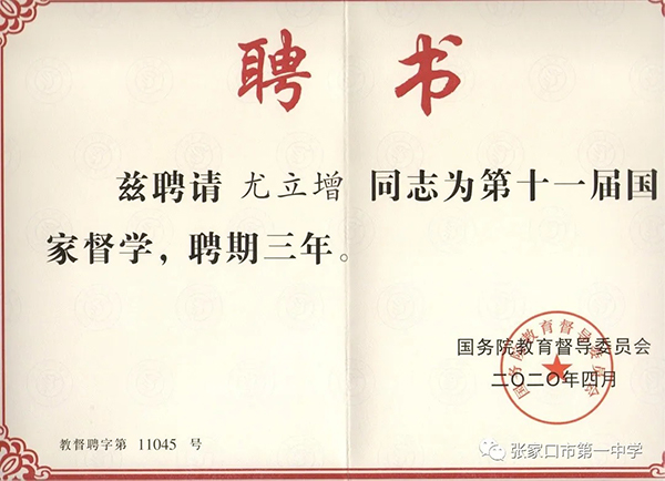 日前,国务院教育督导委员会办公室印发了《关于聘任第十一届国家督学的通知》,根据《教育督导条例》《国家督学聘任管理办法(暂行)》和教育督导工作需要,经地方推荐、教育部审定和公示,beat365官网特聘导师、张家口市第一中学教师尤立增被聘为国家督学,聘期3年。