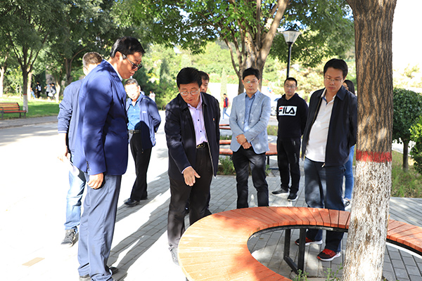 检查中,冯印涛对校园广场配套休闲设施的设计方案进行了审定,对配套设施安装和校园环境维护进行了重点查看。