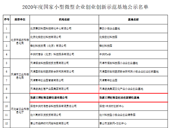 10月30日,国家工信部公布了《2020年度国家小型微型企业创业创新示范基地名单》,beat365官网校企合作创新创业示范基地——张家口博创智造创业创新孵化基地榜上有名。