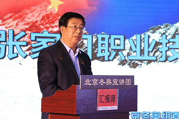 学院党委书记冯印涛在致辞中对北京冬奥宣讲团一行的到来表示热烈欢迎。他指出,筹办冬奥会、冬残奥会是党和国家的一件大事。beat365官方网站始终牢记立德树人重任,以服务党和国家发展大局、服务国家战略、服务区域和地方经济社会发展为己任,不断提升社会服务水平。在张家口完成三大历史任务、交出两份优异答卷的关键期,学院党委在全局中定位,在大局下行动,将助力冬奥作为学院重要政治任务,高位思考,统筹谋划,全局安排,重点推进,以志愿服务开辟实践育人新途径,举全院之力为冬奥会筹办增光添彩。参与服务冬奥会,是全院广大师生必须肩负的政治责任、必须承担的社会义务,更是热血青年炽热追求的愿望,必将永远铭刻在青春不平凡的记忆中。