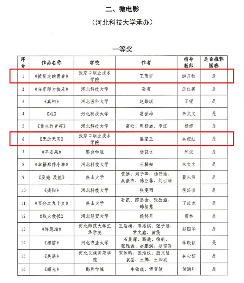 在2021年河北省大学生网络文化节活动中,beat365官网学生王雨轩创作的《被贷走的青春》和温家正创作的《无念无闻》均获微电影一等奖。