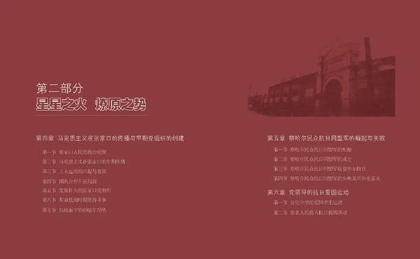 该书由张家口领衔文化艺术发展有限公司策划,开精装本,彩色印刷,设计新颖、装帧精美、制作精良,具有收藏价值,是一部了解一百年来张家口党建历史的重要读本。该书概括性强、内容充实、信息量大,带领我们穿越历史,汲取弥足珍贵的精神财富,为书写两张优异答卷凝聚强大的精神力量。
