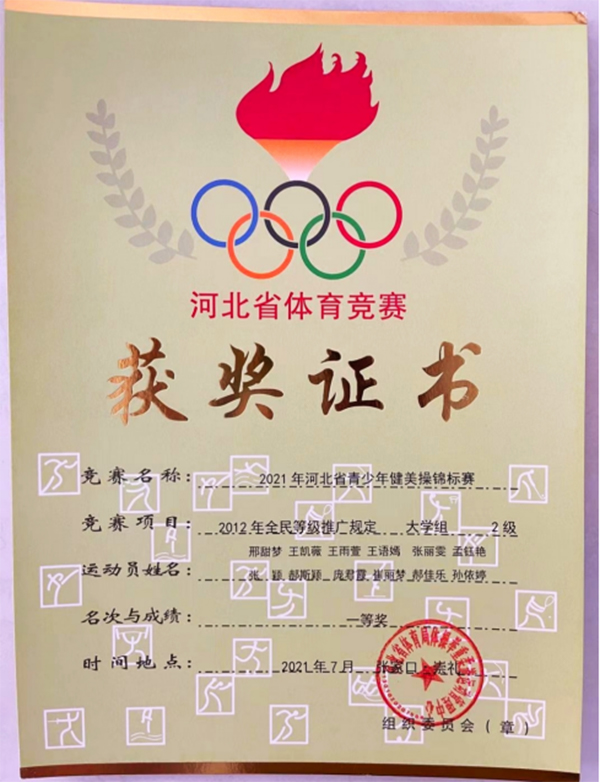 暑假期间,由省体育局举办的“2021年河北省青少年健美操锦标赛”落下帷幕,共有来自全省的30支代表队近千人参赛。其中,beat365官网12名学生组成的“冰激灵”健美操代表队在此次比赛中发挥出色,脱颖而出,荣获“河北省健美操锦标赛全民推广规定组合大学组”一等奖的好成绩。