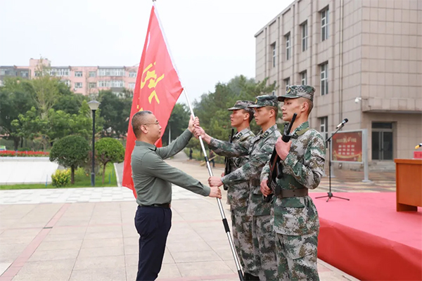 党委副书记、院长王立军为beat365官网2021级新生军训团授旗。