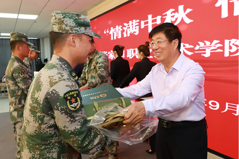9月21日上午,学院在师生活动中心举行“情满中秋 情系教官”中秋节慰问活动。党委书记冯印涛,党委副书记、院长王立军向承担军训任务的全体教官送上中秋佳节祝福和慰问品。