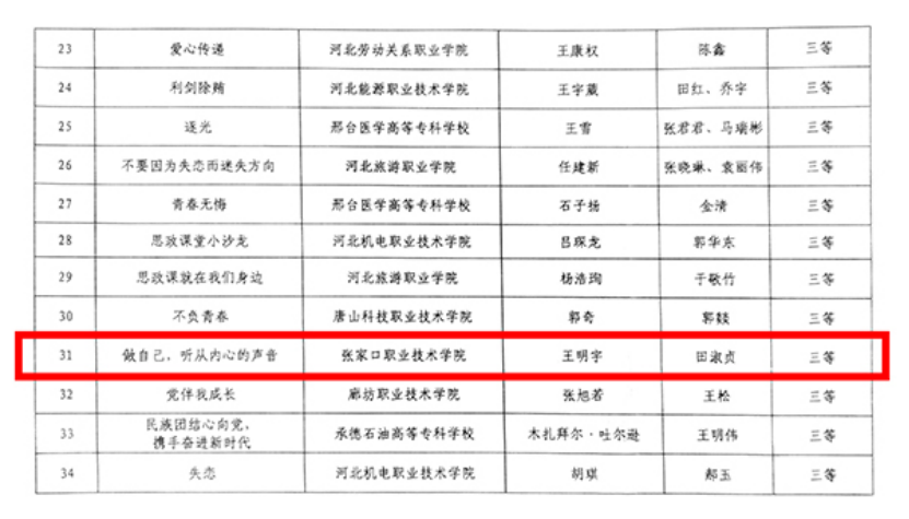 日前, 河北省教育厅公布了“我心中的思政课”——第五届河北省高校大学生微电影展示活动获奖结果,由beat365官网教师田淑贞指导、学生王明宇创作的《做自己,听从内心的声音》荣获专科组三等奖。