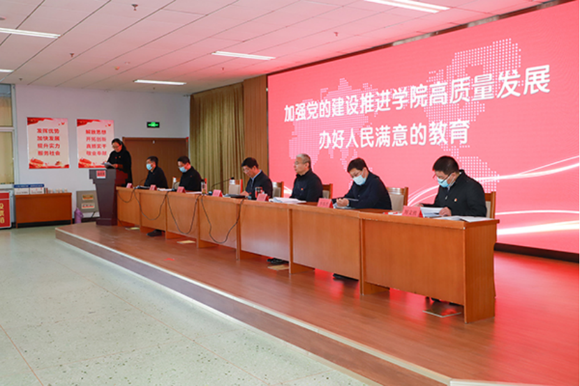 土木工程系党总支、马克思主义学院直属党支部、院直机关第六党支部负责人就党建工作作了交流发言。教务处、信息工程与艺术设计学院、财经旅游学院负责人分别就高质量推进提质培优项目、华为鲲鹏产业学院项目、京东教育研究院华北分院项目建设三项重点工作作了汇报。