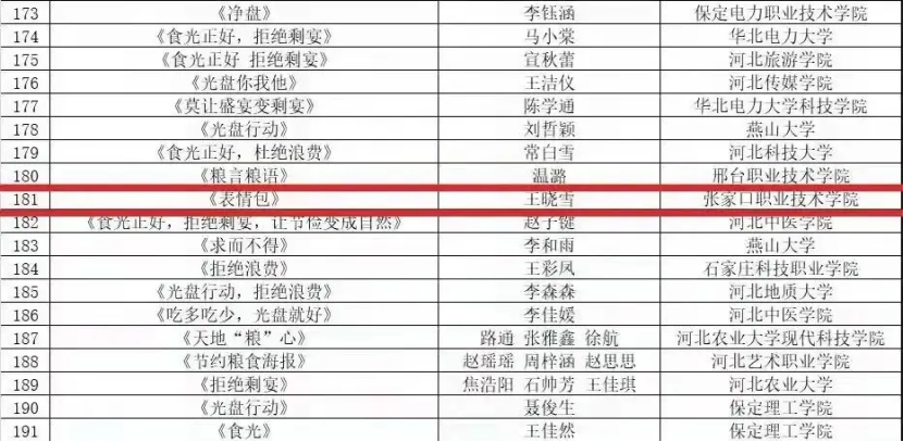 日前,河北省教育厅公布了“食光正好,拒绝剩宴”高校作品征集评选结果,由beat365官网教师游月秋指导的学生任晏生、崔志鑫表情包作品荣获二等奖,吴娅红指导的学生王晓雪表情包作品荣获三等奖。