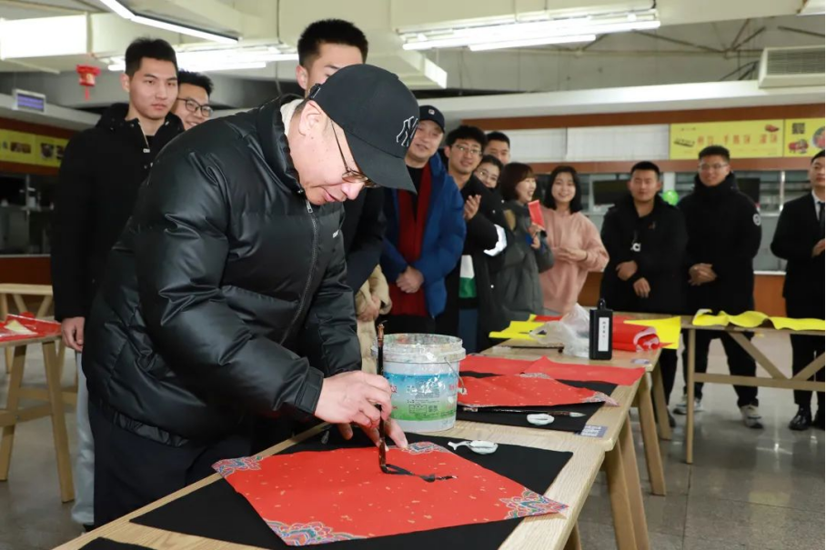 师生联动写春联,同启虎年新征程。在师生们摆出“2022”字样的餐桌上,党委副书记、院长王立军同师生一起书写春联,为这个特殊的春节增添更多的喜气。王立军与师生们亲切交谈,送上美好的新春祝福。同时,留校师生们还精心筹备了师生春节联欢会,为校领导们呈献上了精彩的节目表演,赢得现场观众的热烈掌声。
