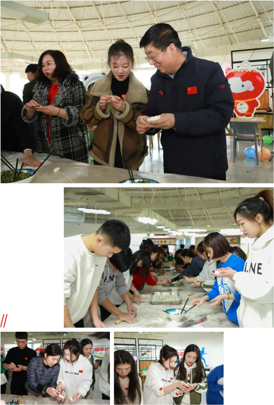 经过留校师生们精心布置学院文飨餐厅内,环境焕然一新,处处洋溢着浓浓的年味。党委书记冯印涛同留校师生们一起包饺子话家常,共迎新春佳节,共叙新年愿景。过程中,冯印涛与师生们交流着包饺子的方法和各地过年的习俗,关切地询问师生们训练和生活情况,叮嘱他们要常与父母亲友沟通联系,相互关心,互帮互助,共同度过一个温暖、充实、祥和的春节。冯印涛还鼓励大家要刻苦训练,用最好的精神状态完成冬奥会重点文化活动任务。