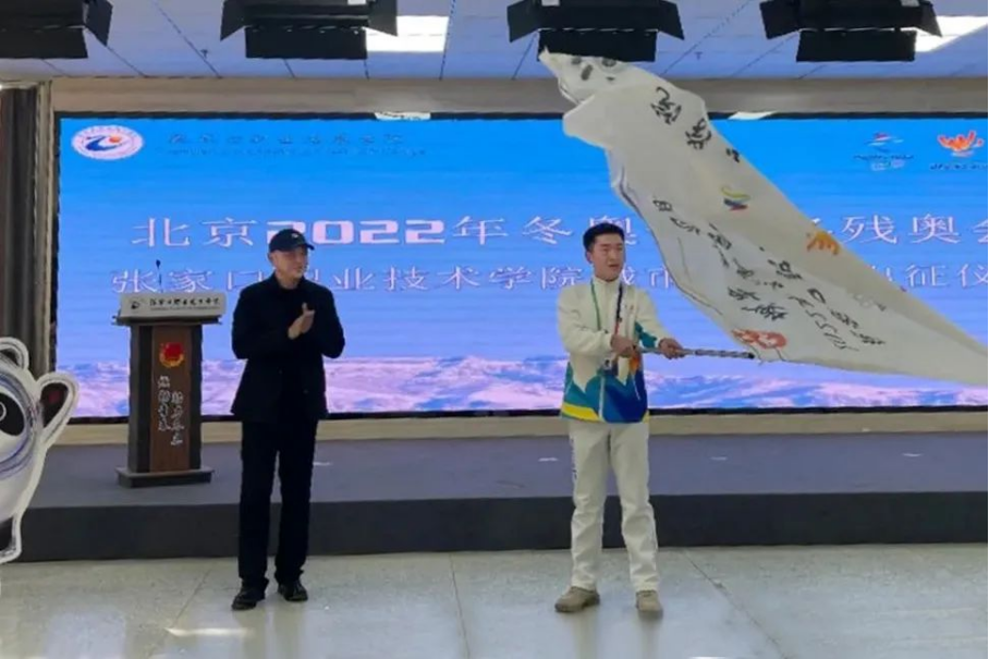 副院长张东兵为冬残奥会城市志愿者授旗,信息工程与艺术设计学院学生闫秋宏代表全体志愿者接旗。城市志愿者安世行带领全体志愿者宣誓。