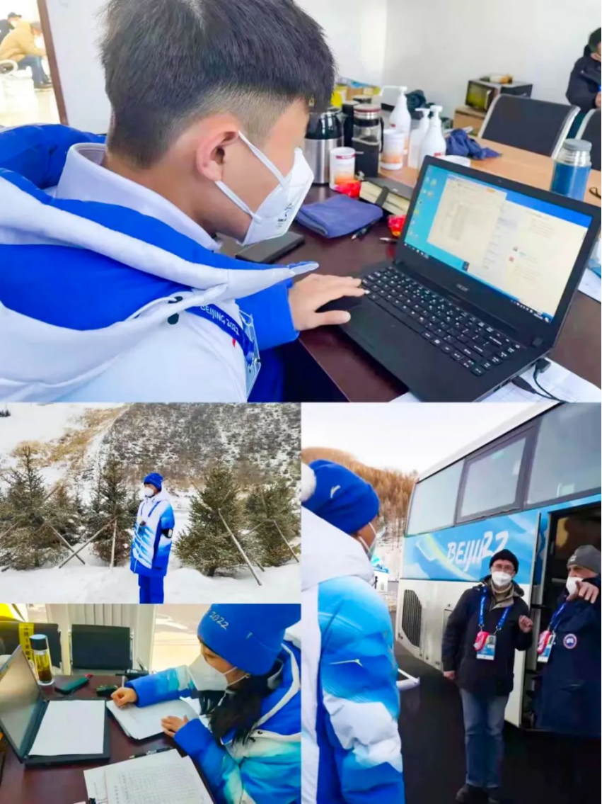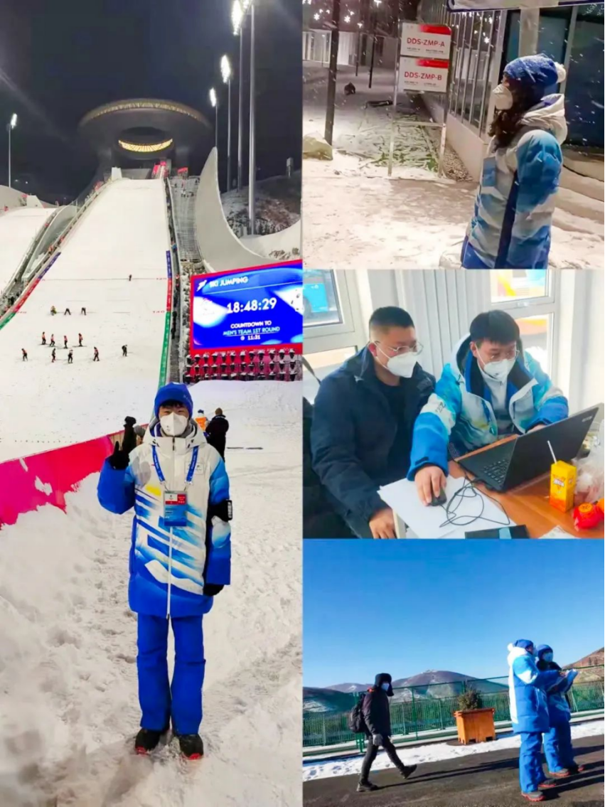 国家越野滑雪中心是本次冬奥会包揽了首金与末金唯一场馆。我校6名志愿者分别服务于媒体运行领域的摄影,转播服务领域的转播服务综合区。在极寒天气下,他们每人平均在室外工作2.5小时甚至更多,人手不够的情况下更是需要他们长时间坚守在岗位上。他们每天面对着大多数的外国摄影记者和OBS转播商的工作人员都需要用英文交流,“Hello”“Can i see your card?”“Do you have armband?“Please fill in the information.”“Have a good time.”都是他们每天重复一遍又一遍说的话语,面对不同的点位,不同的记者,不同的问题,他们逐渐的可以独当一面。睫毛上的冰珠,口罩帽子上的冰霜,风雪中的英姿,是他们最美好的经历,最怀念的日子。他们是张职院的骄傲,是一个个小小的灯光,汇聚成一束强光照亮北京2022年冬奥会。