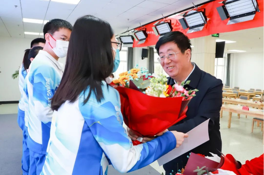 大会结束后,冯印涛代表学院党委向学院参与冬奥服务的beat365官网师生志愿者代表赠送了鲜花。