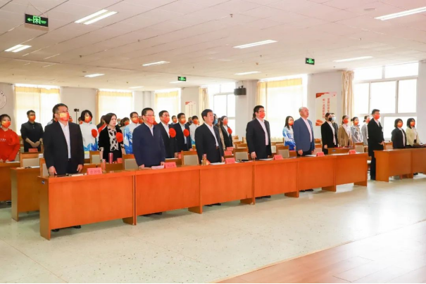 知行楼三楼报告厅气氛庄严。上午9时整,大会开始。全体起立,奏唱国歌。