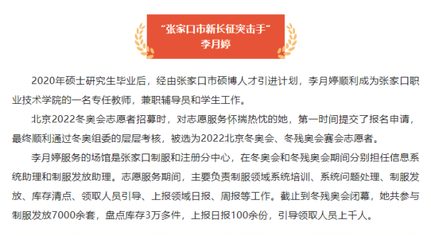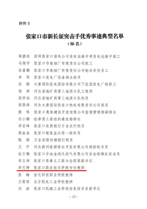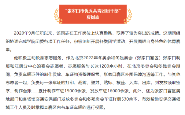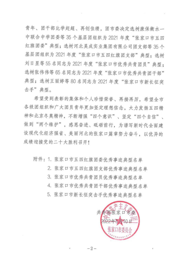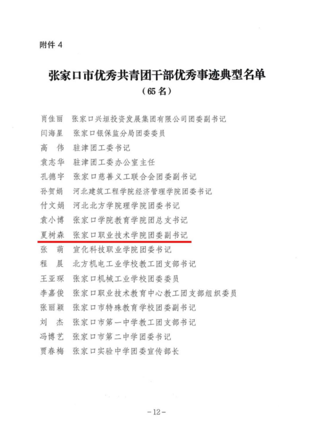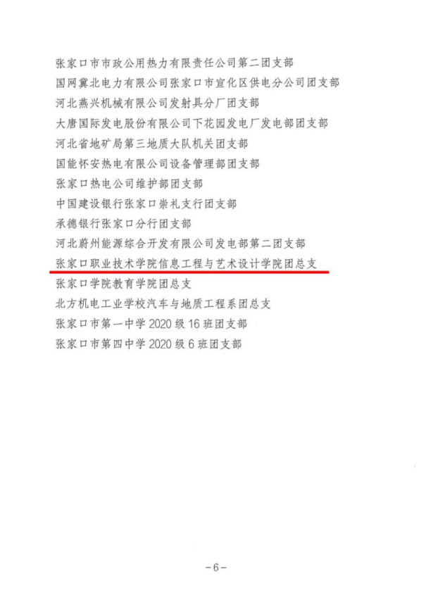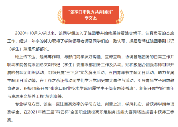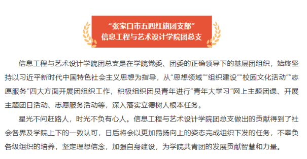 青春心向党、建功新时代。日前,共青团张家口市委印发《关于选树2021年度全市“五四红旗团委(团支部)”“优秀共青团员”“优秀共青团员干部”“新长征突击手”事迹典型的决定》。beat365官网信息工程与艺术设计学院团总支荣获“张家口市五四红旗团支部”称号;2020级团属学生组织干部李文杰荣获“张家口市优秀共青团员”称号;学院团委副书记夏树森荣获“张家口市优秀共青团干部”称号;专任教师李月婷荣获“张家口市新长征突击手”称号。