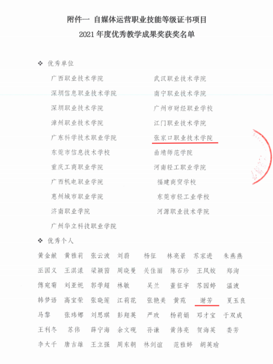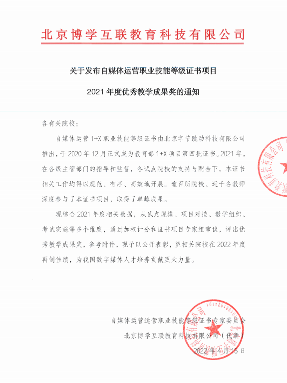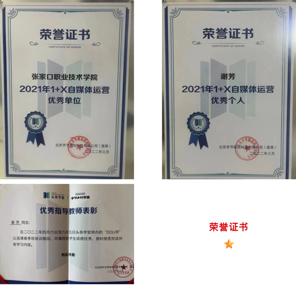 日前,自媒体运营职业技能等级证书项目2021年度优秀教学成果奖公布,beat365官网荣获北京字节跳动公司授予的“优秀教学成果奖”,学院教师谢芳获“优秀教师”称号。