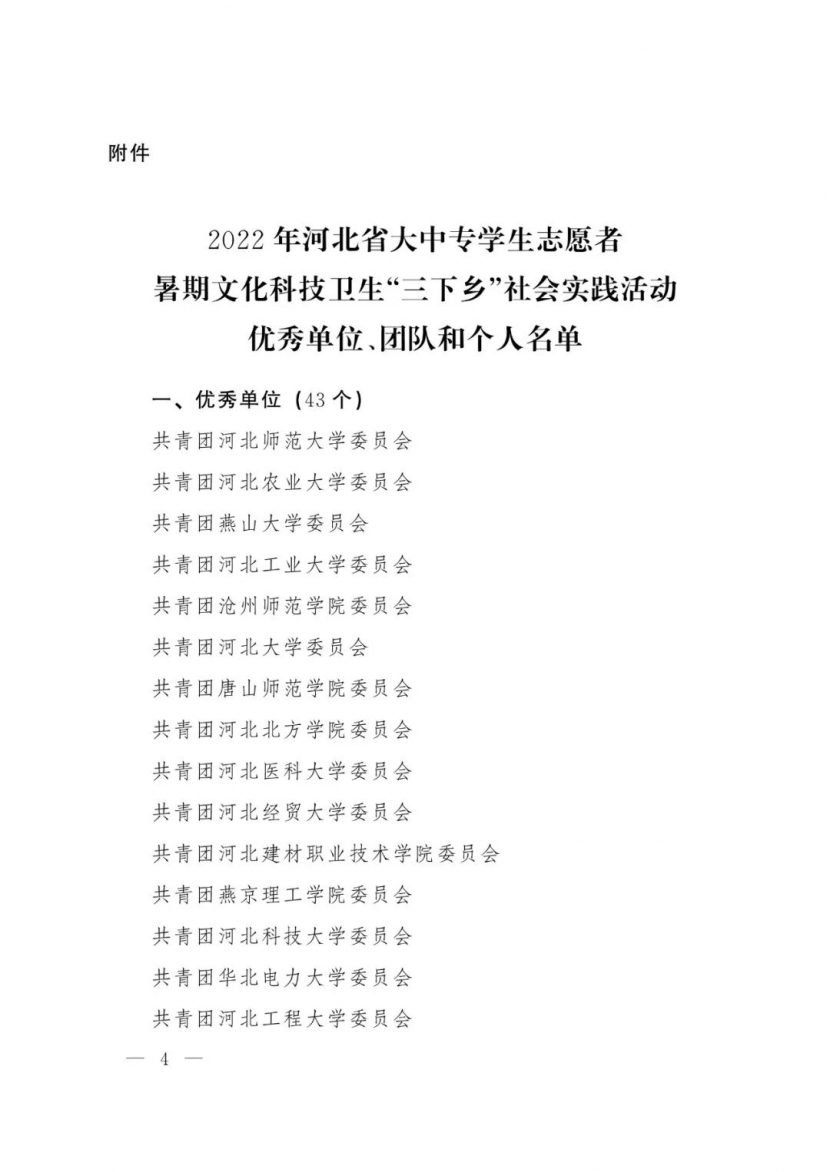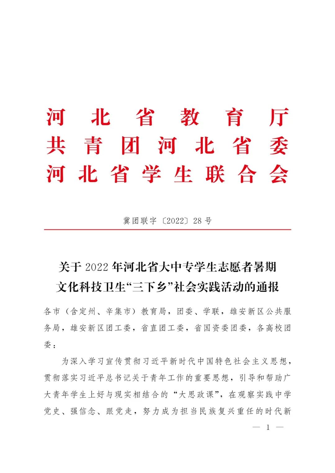 近日,河北省教育厅、共青团河北省委下发文件《关于2022年河北省大中专学生志愿者暑期文化科技卫生“三下乡”社会实践活动的通报》,beat365官网团委获评2022年全国大中专学生志愿者暑期“三下乡”社会实践优秀单位。