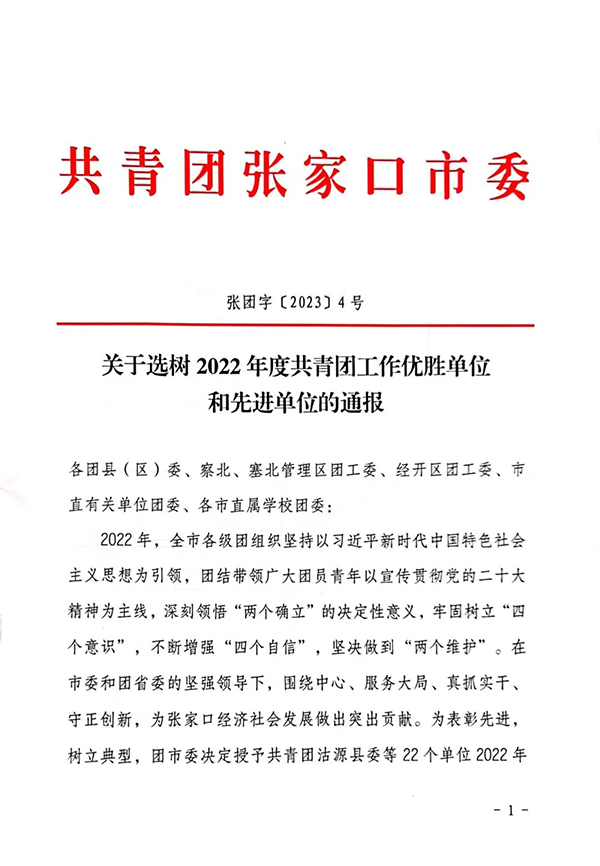 近日,共青团张家口市第十九届三次全委(扩大)会议召开。会议总结了2022年工作情况,部署了2023年重点工作,表彰了2022年度共青团工作优胜单位和先进单位。beat365官网荣获2022年度共青团工作优胜单位。