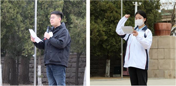 青年教师代表贾斌,在纪念塔前进行发言,呼吁广大青年学子珍惜先烈们用鲜血换来的和平岁月,不忘先烈遗志,红心永铸,甘当炬火照亮人民与祖国前行的道路。学生代表朱思臻带领祭扫师生宣誓,声声饱含革命精神和致敬英雄的誓词在肃穆的陵园激荡、回响。