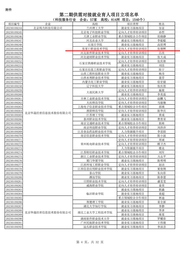供需对接就业育人项目分为定向人才培养培训项目、就业实习基地项目、人力资源提升项目、重点领域校企合作项目共四类。定向人才培养培训项目由用人单位与高校协同制定培养方案,实施长期系统定向培养或短期就业能力培训,为用人单位输送急需紧缺人才。