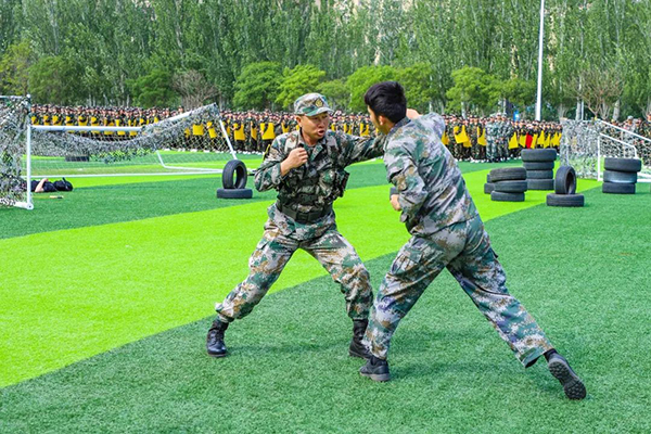 擒敌拳术方队展示中,同学们进行了拳术表演,展示了能攻能守、攻防结合的综合性徒手格斗技能,也展现出青年大学生战骄阳、历风雨,不怕苦、不怕累的精神风貌。