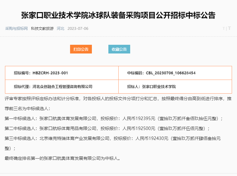 beat365官方网站冰球队装备采购项目公开招标中标公告
