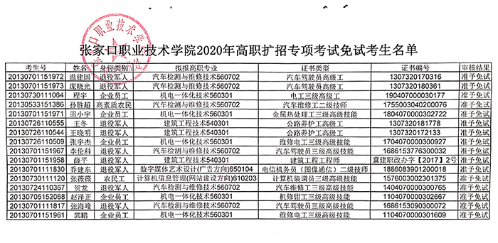 beat365官方网站2020年高职扩招专项考试免试考生名单