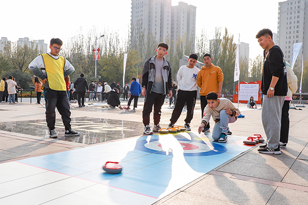 在旱地冰壶PK项目中,志愿者选手依次站在投壶区内,投掷队员半弯身体,右手紧握冰壶手柄,让冰壶依靠惯性滑向圆心,同时尽量将对方冰壶撞出。