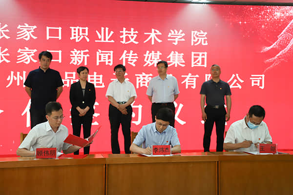 在随后进行的校企合作签约仪式上,常务副院长李炜杰、张家口新闻传媒集团副总经理王哿、北京神州优品电子商务有限公司负责人顾伟朋代表三方进行签约。